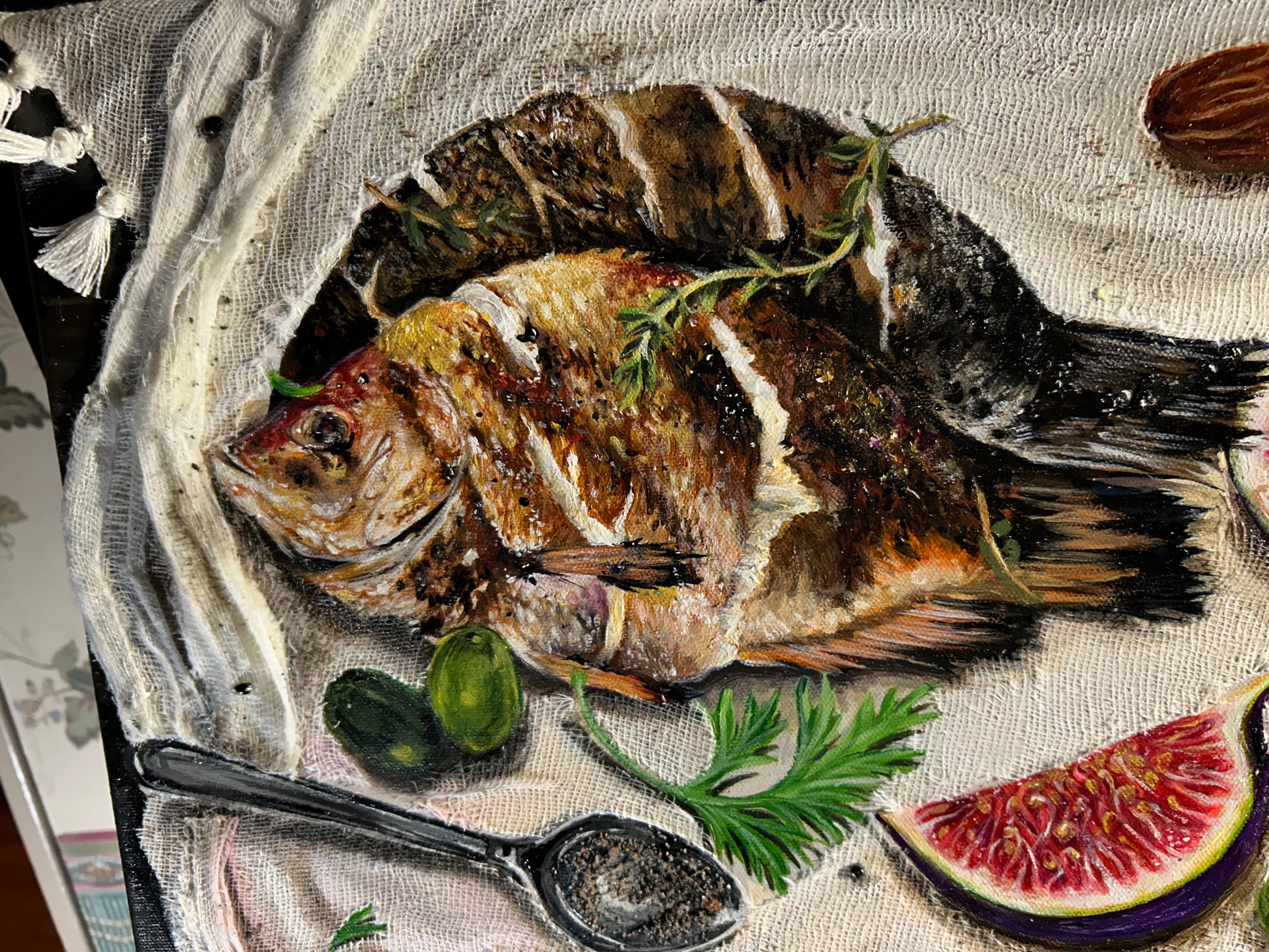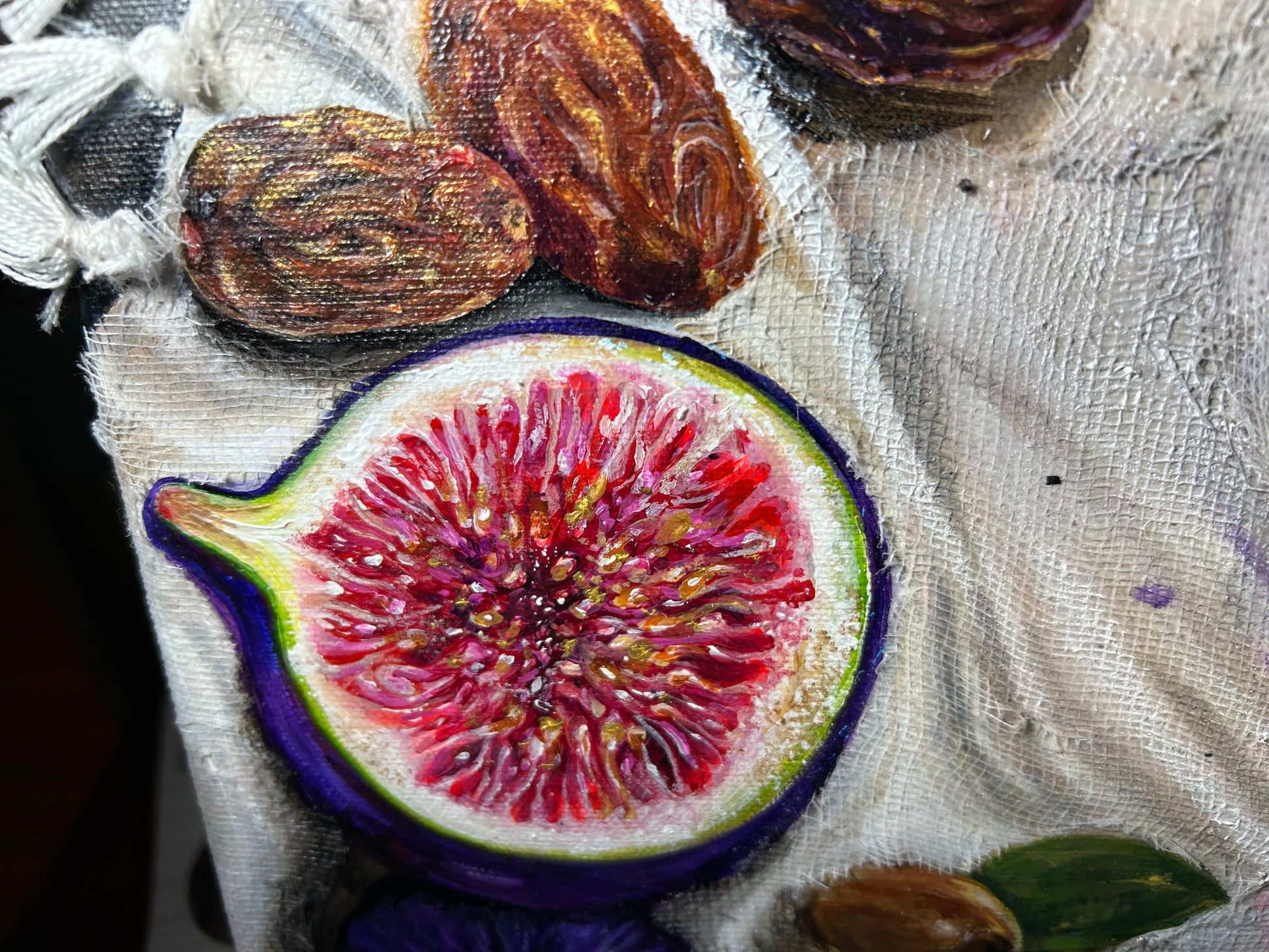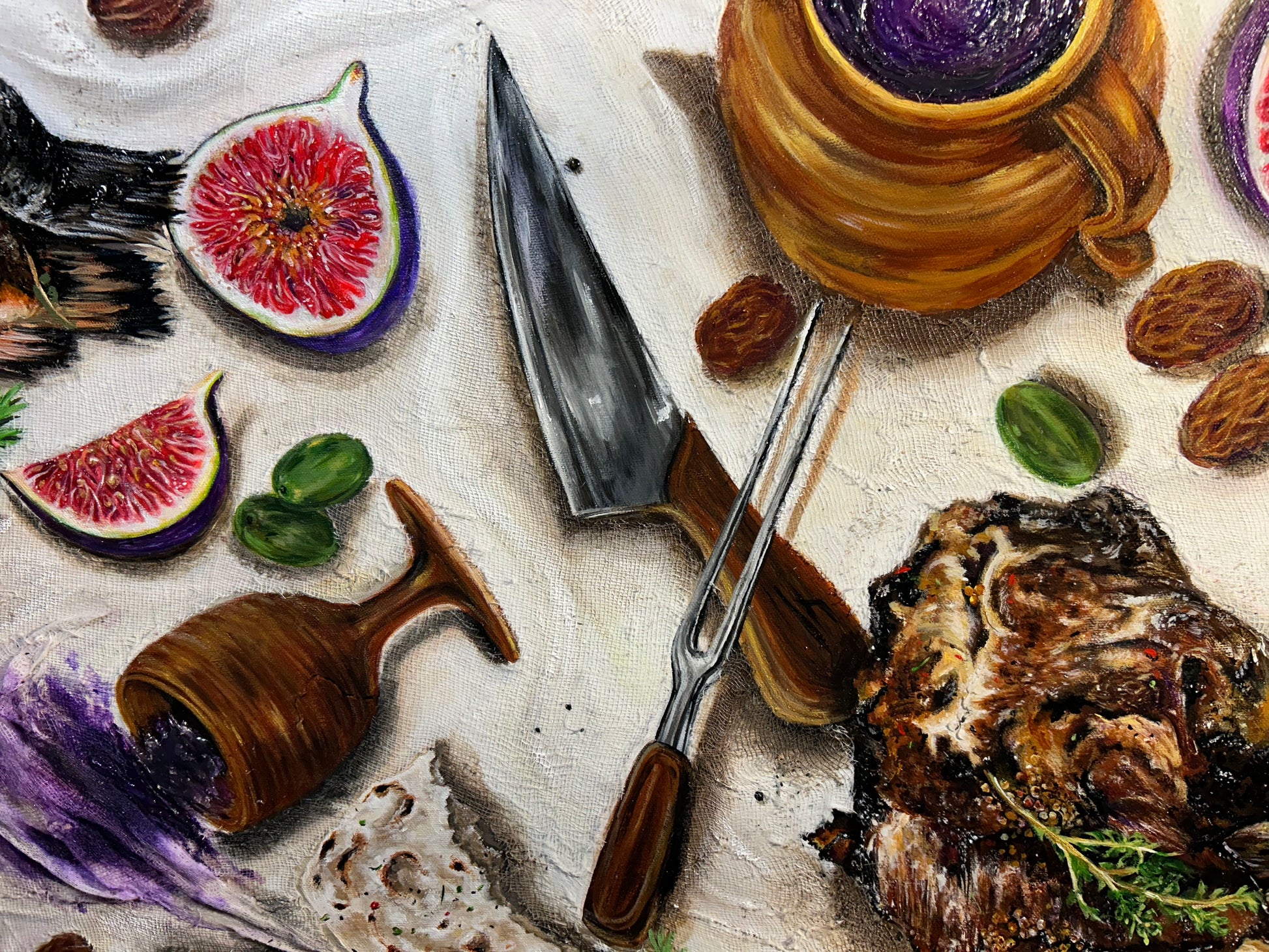 23"x35" Acrylic, fabric, and embroidery thread on canvas! A delectable spread of the dynamic Mediterranean meal prepared for the Last Supper. This painting would be an appetizing addition to your kitchen, home, or an amazing gift to an art loving friend!