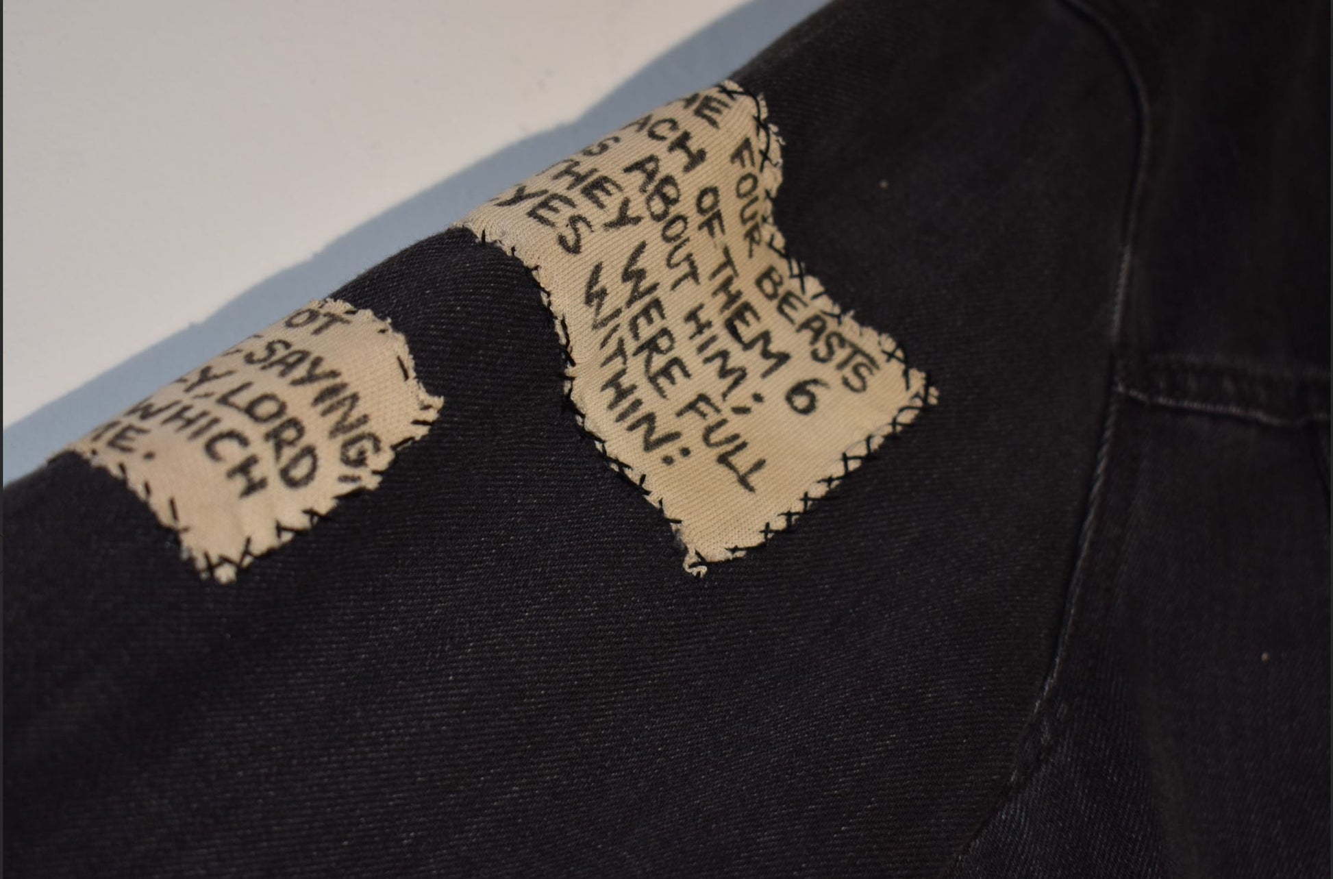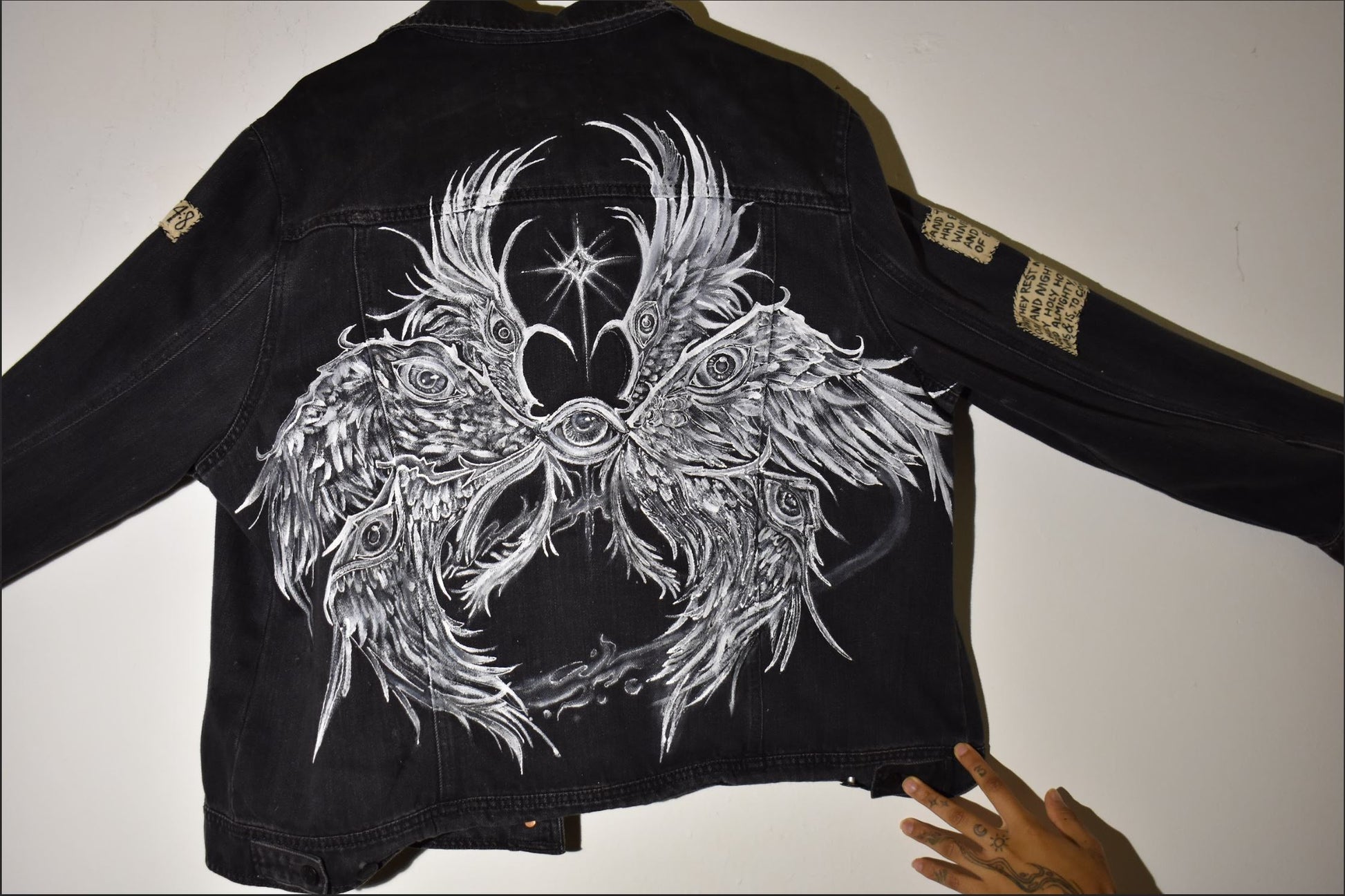 Acrylic and textile medium on XL vintage old navy black denim, unisex. Hand lettered, painted, and detailed logo and seraph illustration. 100% Original art and design, certification of authenticity. One of a kind!